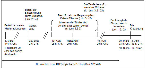 Der Anfang ist durch den Befehl Jerusalem wiederherzustellen und zu bauen gegeben. Dieser Befehl wurde gemäß Nehemia 2: 1-8 vom König Artahsasta im 20. Jahr seiner Herrschaft im Monat Nisan erlassen. Aus Geschichtsquellen wissen wir, dass dieser Zeitpunkt der 5. März 444 v. Chr. war.
